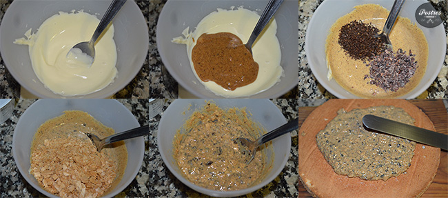 Una vez que tengamos el daquoise frio empezaremos a preparar el crujiente que ira encima, cogemos un bol y fundimos el chcocolate, ahora lo mezclamos con el praliné de avellanas y añadimos el café en grano machacado para que queden trocitos pequeñitos, después añadimos las neulas troceadas y los nibs de cacao. Mezclamos todo bien y lo extendemos sobre el daquoise (lo ideal sería darle la vuelta, ya que resulta más fácil extenderlo por la otra cara) con ayuda de una espátula hasta que quede una capa fina. Después lo congelamos.