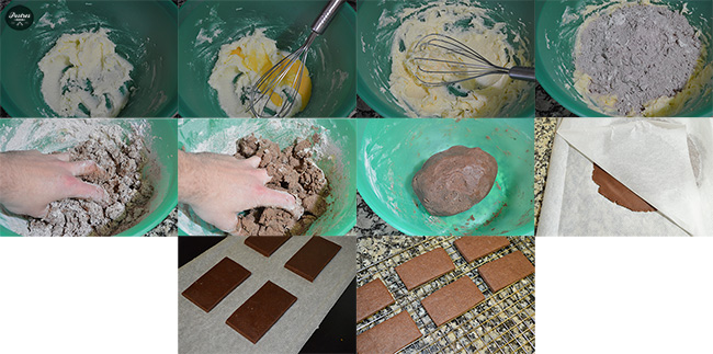 Cuando se haya endurecido la masa, la sacamos de la nevera y la estiramos entre dos hojas de papel de horno para que no se nos enganche en el rodillo, una vez estirada la metemos 5 minutos en el congelador para que se endurezca, la sacamos y cortamos rectángulos de 9 cm de largo y 5 cm de ancho, una vez cortados volvemos a meter la bandeja otros 5 minutos en el congelador (de este modo las podremos mover sin que se deformen) después con ayuda de una espátula las vamos colocando en la bandeja del horno. Horneamos hasta que estén ligeramente doradas, unos 15 minutos a 170ºC. Dejamos enfriar.