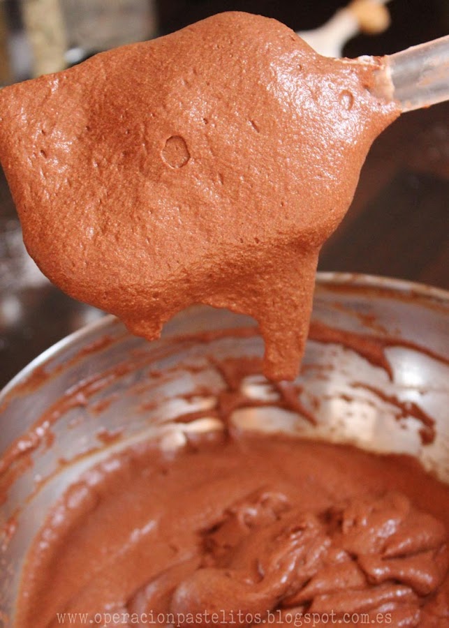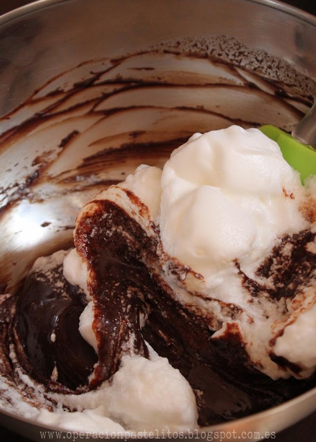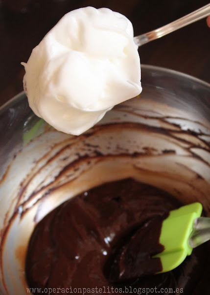 5. Incorporamos el cuarto de las claras montadas a la mezcla de chocolate y removemos para aligerar la preparación. Luego vamos añadiendo el resto de las claras montadas suavemente con la ayuda de una espátula desde abajo hacia arriba intentando que no bajen las claras.