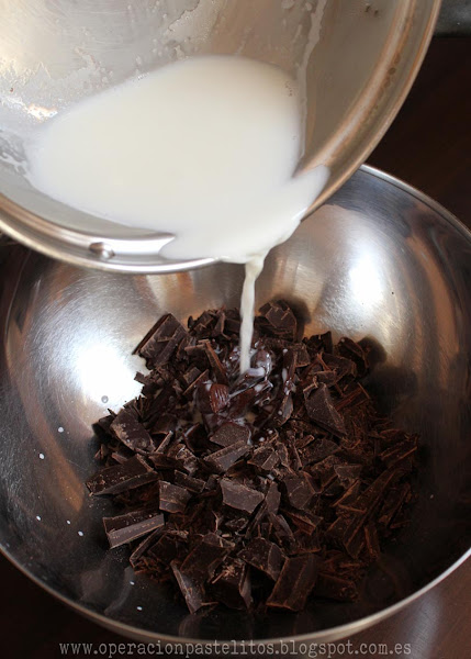 2. Hervimos la leche en un cazo y luego la echamos encima del chocolate troceado. Removemos con una espátula o una cuchara hasta que se derrita el chocolate por completo y consigamos una mezcla suave y brillante.