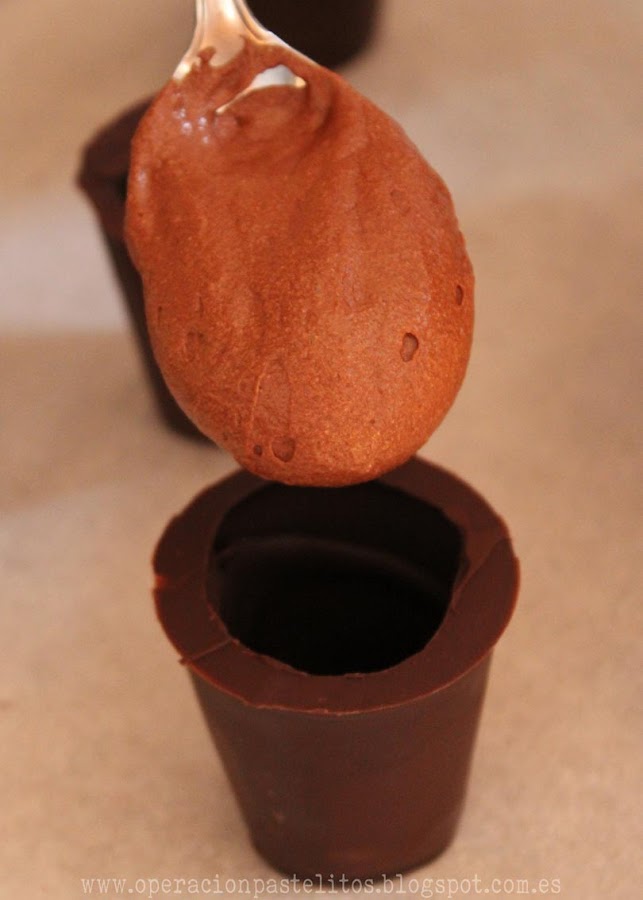 7. Ahora cogemos nuestros vasos de chocolate y los rellenamos con la mousse de chocolate.