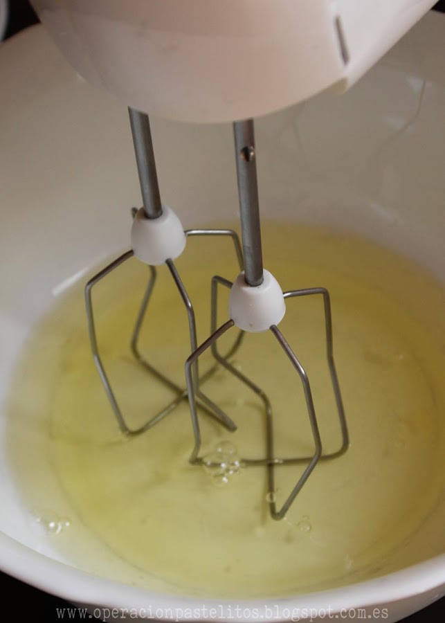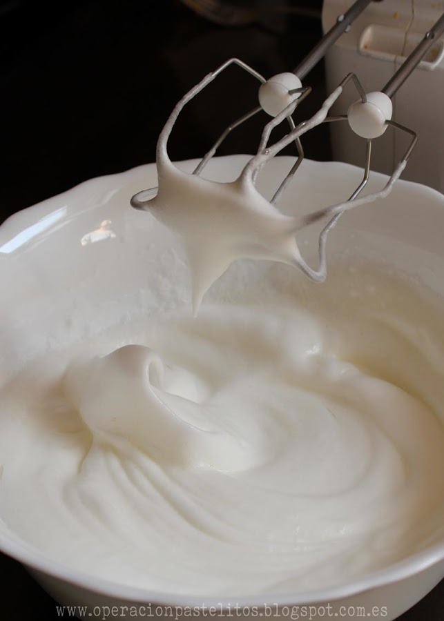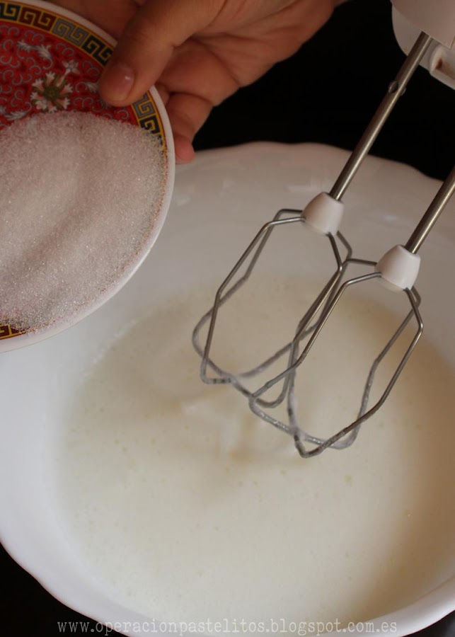 4. Montamos las claras a punto de nieve con la ayuda de una batidora eléctrica y luego agregamos el azúcar y seguimos batiendo hasta conseguir unas claras bien firmes.
