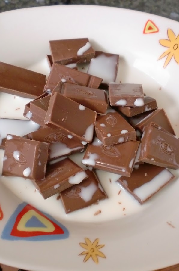Derretimos el chocolate junto con la leche. Yo lo hago en el microondas lo meto 30s compruebo y otros 30s, pero podeis hacerlo al baño Maria.