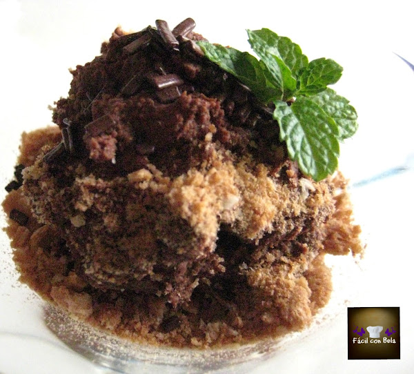 Para hacer la decoración ponemos un poco de mousse, barquillos triturados, unos fideos de chocolate, una hoja de menta y listo para comer!!!