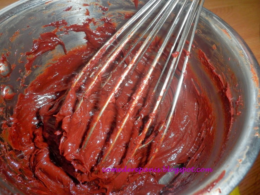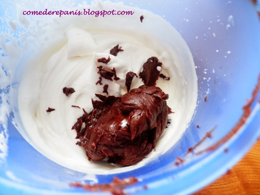Cuando tengamos la nata (crema de leche) bien mezclada agregamos el chocolate de tres veces, es decir, añadimos una tercera parte, mezclamos bien y luego continuamos batiendo.