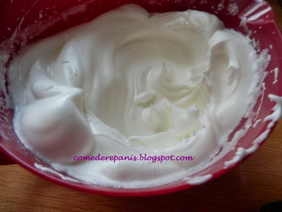 Aparte en un bol batimos las claras y cuando comiencen a subir les añadimos el azúcar, continuamos batiendo hasta obtener un merengue perfecto, que demos la vuelta al bol y las claras no se vuelquen.
