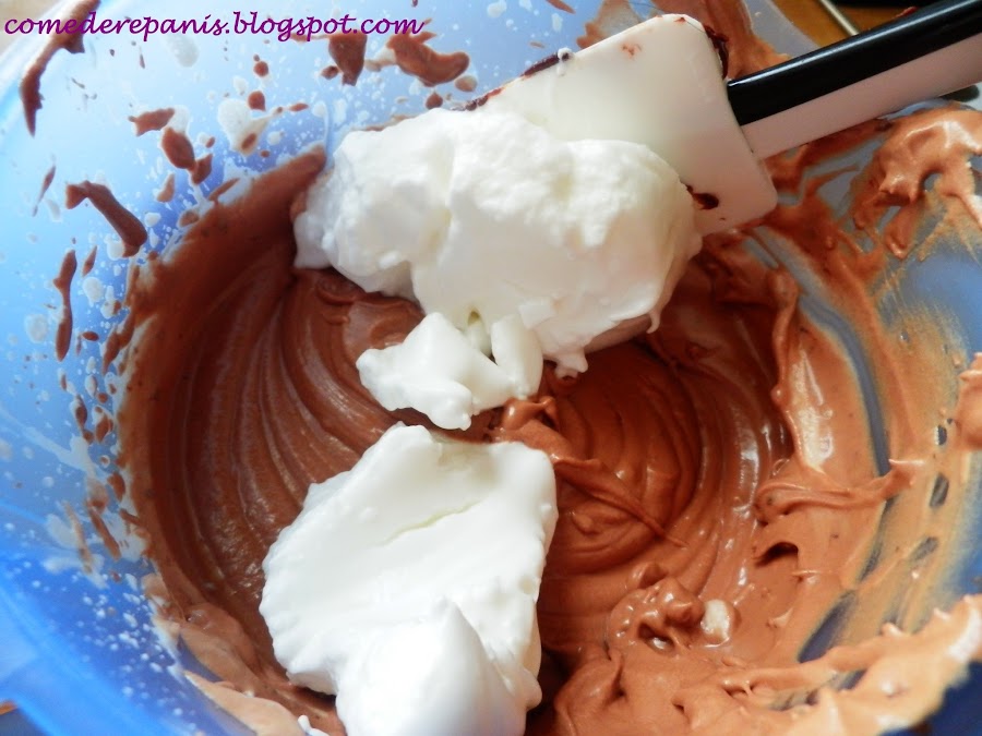Cuando hayamos incorporado todo el chocolate dejamos a parte las varillas y cogemos una espátula de silicona y comenzamos incorporando el merengue de poco a poco y sin batir. Debemos mezclar con movimientos envolventes, muy suaves para que el aire no se nos escape y el mousse quede esponjoso.