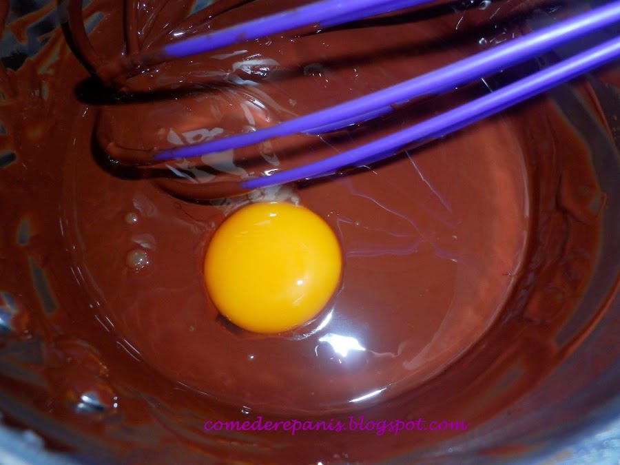Agregamos las yemas al chocolate de una en una, mezclando muy bien antes de añadir la siguiente. Una vez incorporadas las cuatro yemas reservamos. Si notamos que el chocolate esta bastante duro y no podemos batirlo podemos añadir una cucharada de agua pero sin pasarnos, es normal que al enfriarse el chocolate se endurezca.