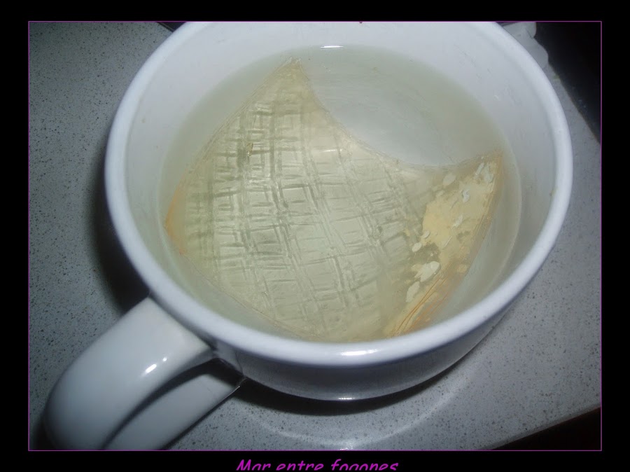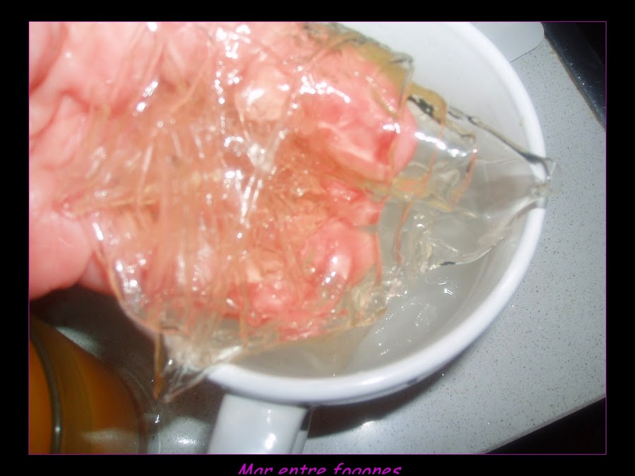 Metemos las láminas de gelatina en agua fria en una taza grande.