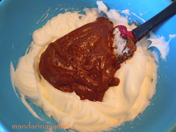 Coge una cucharada de las claras montadas y mezcla con el chocolate y yemas, mueve con cuidado hasta que sea una mezcla cremosa.