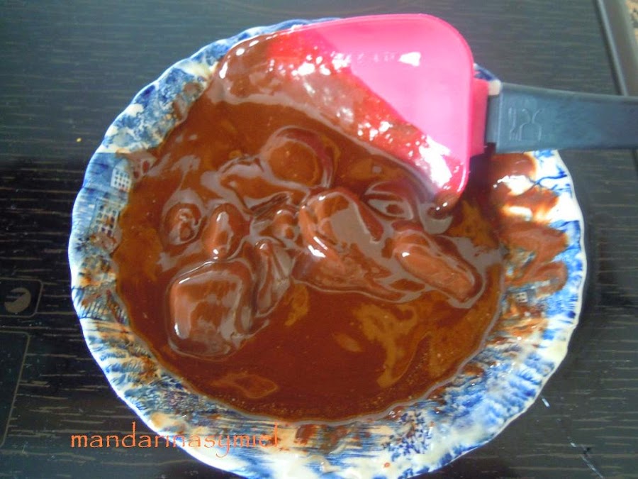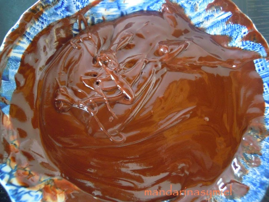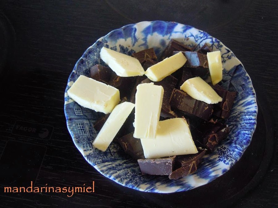 Funde el chocolate con la mantequilla troceada en el microondas, hazlo poco a poco y controlando el chocolate para que no se pase. Saca cada 15 o 20 segundos y remueve para que se reparta el calor (ten en cuenta que el chocolate retiene el calor en su interior y cuando lo sacas del microondas sigue fundiéndose al removerlo). También puedes fundirlo al baño maría.