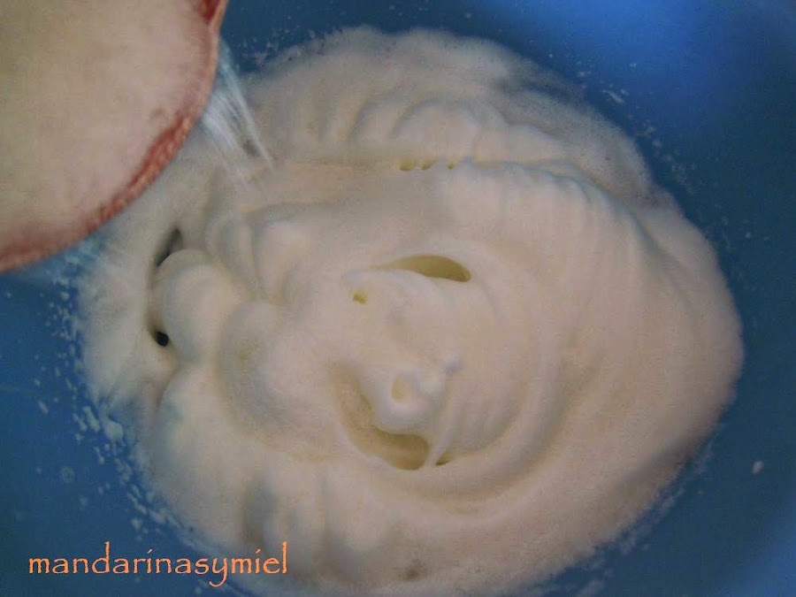 Monta las claras a punto de nieve con la mitad del azúcar (monta primero las claras y luego le añades el azúcar, así se montan mejor). Reserva.