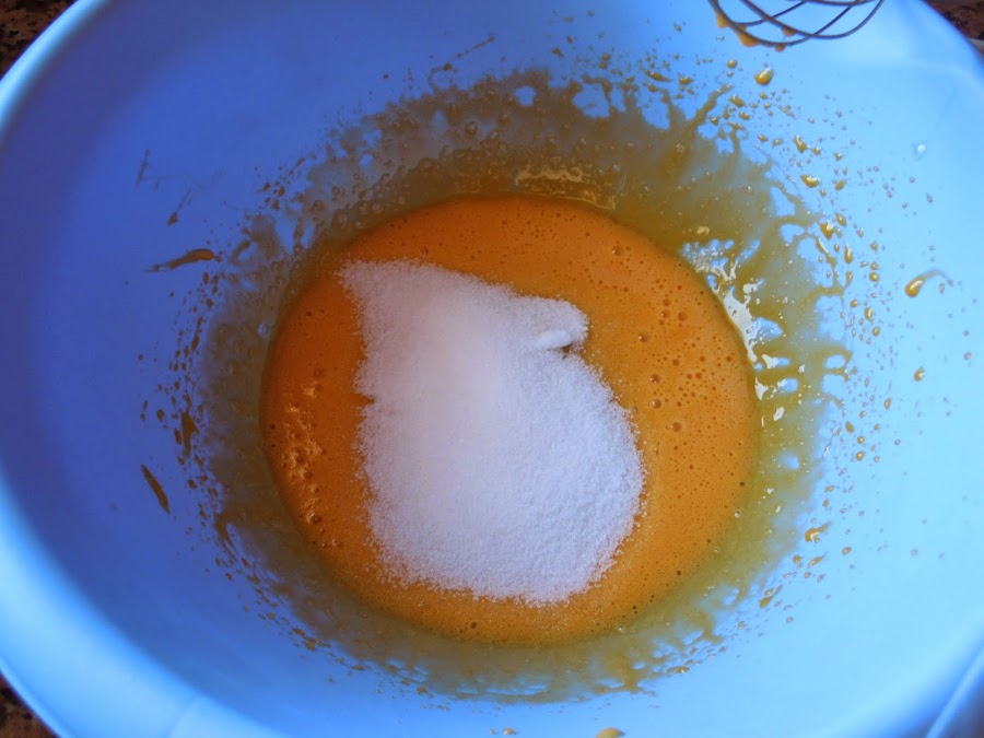 Añade a las yemas el azúcar que queda y bátelo bien con unas barillas hasta que blanqueen un poco.