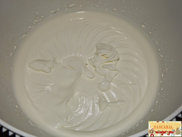 Montamos la nata (crema de leche) ( en el caso que no hayas comprado la nata (crema de leche) ya montada) una cosa si vas ha montar tu la nata (crema de leche) en el primer paso no pongas todo el azúcar, pon solo la mitad, así utilizaras la otra mitad para montar la nata (crema de leche). Se añade cuando empieza la nata (crema de leche) a tomar forma...y recuerda que tiene que estar la nata (crema de leche) muy fría y el bol también.....