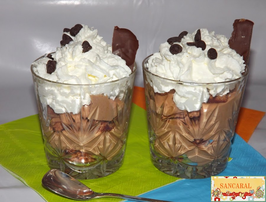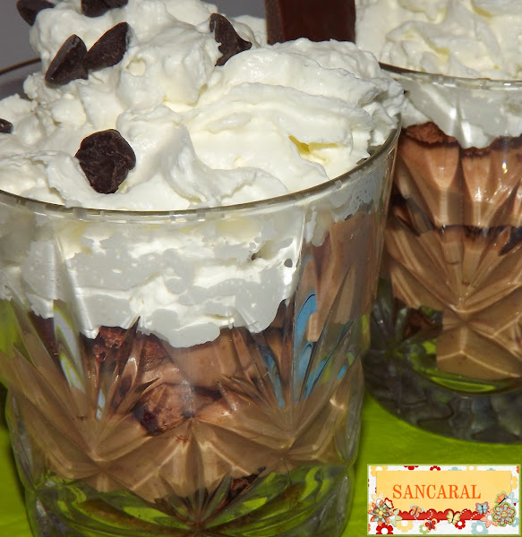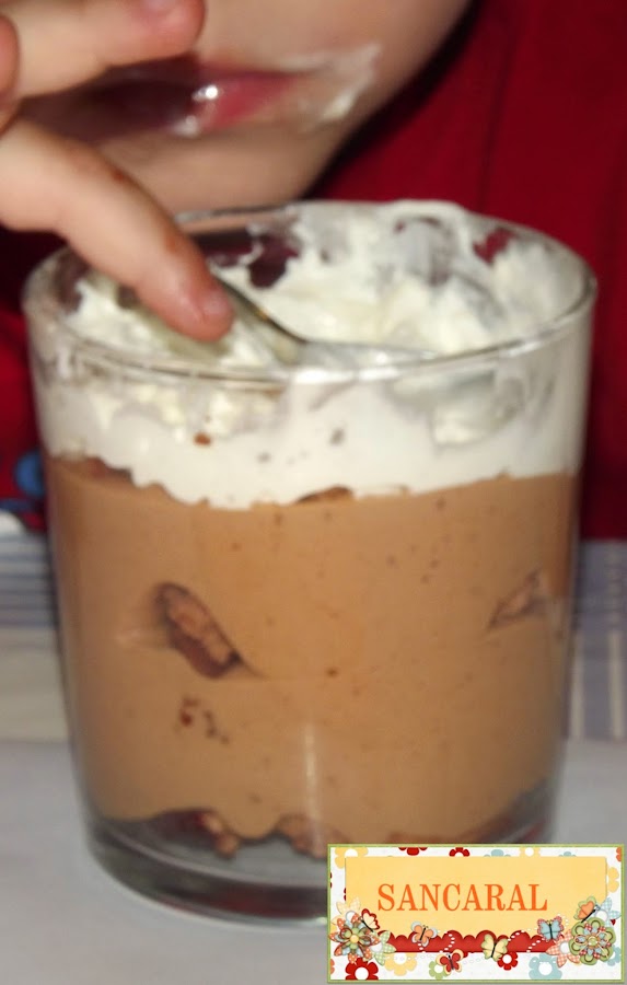 Como te he dicho antes yo he intercalado la mousse con trozos de bizcocho de chocolate...y he añadido nata montada (crema de leche) para acabar de decorar...