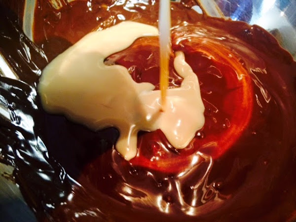 Ahora derretiremos el chocolate al baño maría. Para eso, ponemos un cazo con agua a caletar y encima un cuenco. Echamos en el cuenco el chocolate troceado y removemos continuamente hasta que esté completamente derretido. En ese momento, echamos el chorrito de crema de orujo si hemos decidido incluirlo en la mousse y removemos para que se integre en el chocolate.