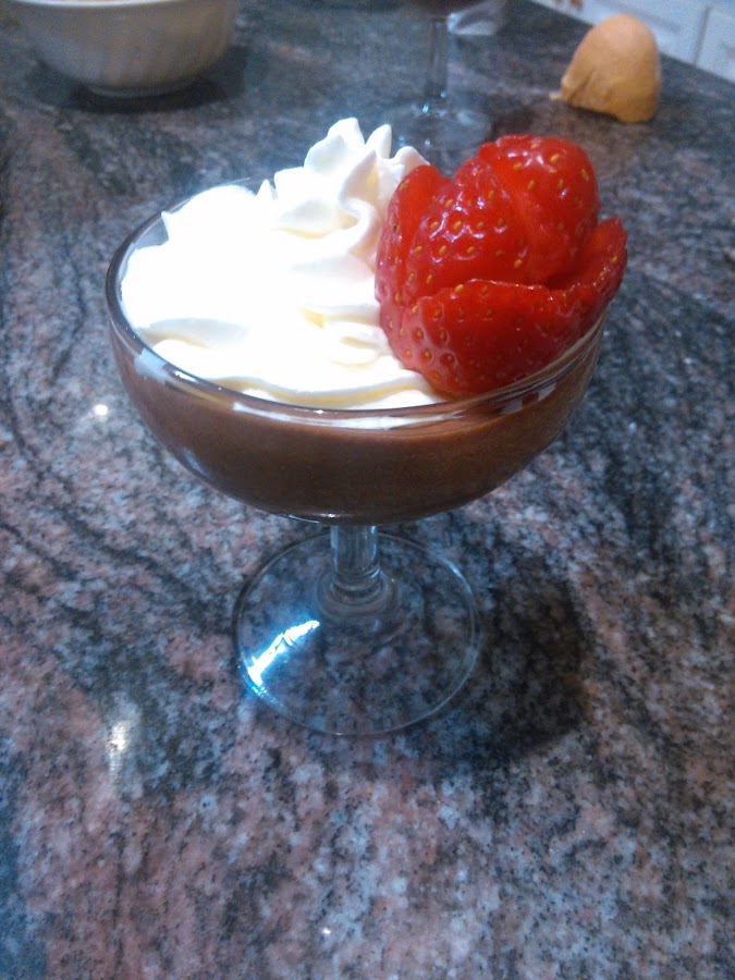 Decoramos con una fresa y una montaña de nata montada (crema de leche).