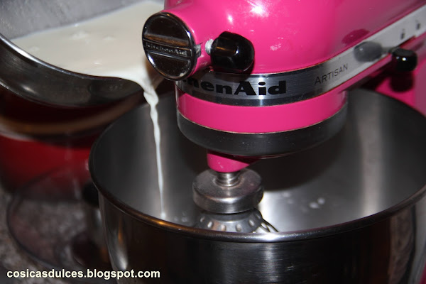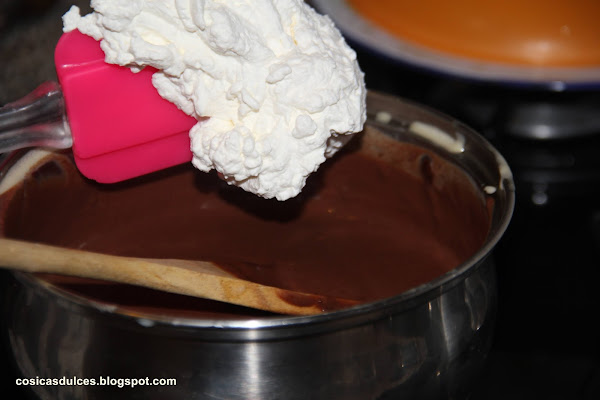 Cuando esta mezcla alcance una temperatura de unos 35º le añadimos la nata (crema de leche) (230 gramos) que previamente habremos montado.