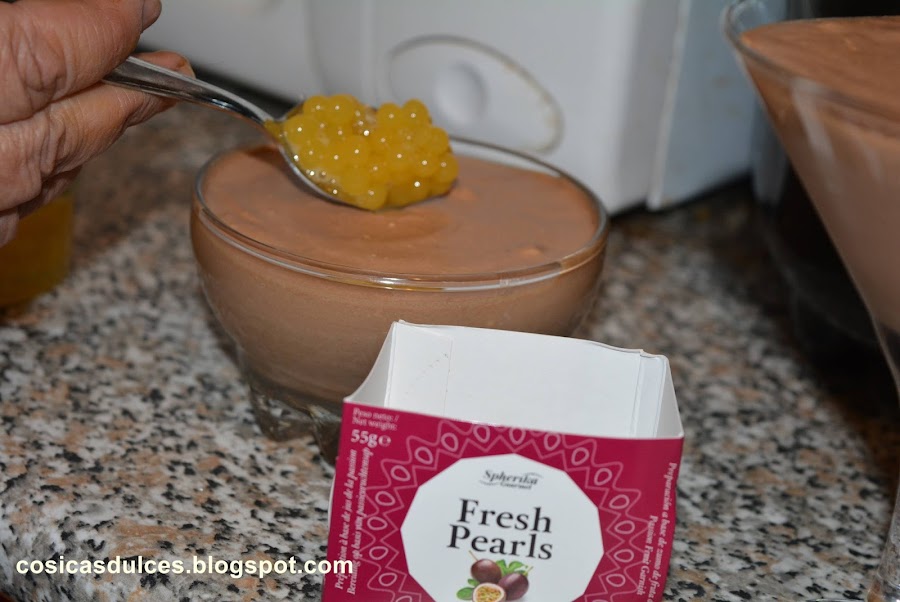 Repartimos la mousse en copas y dejamos enfriar hasta que tome textura. Antes de servir coronamos con unas esferificaciones de fruta de la pasión.