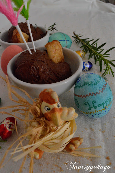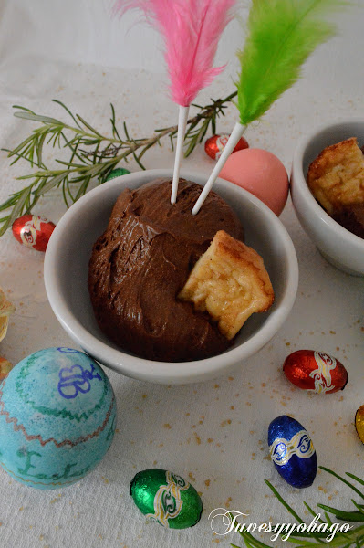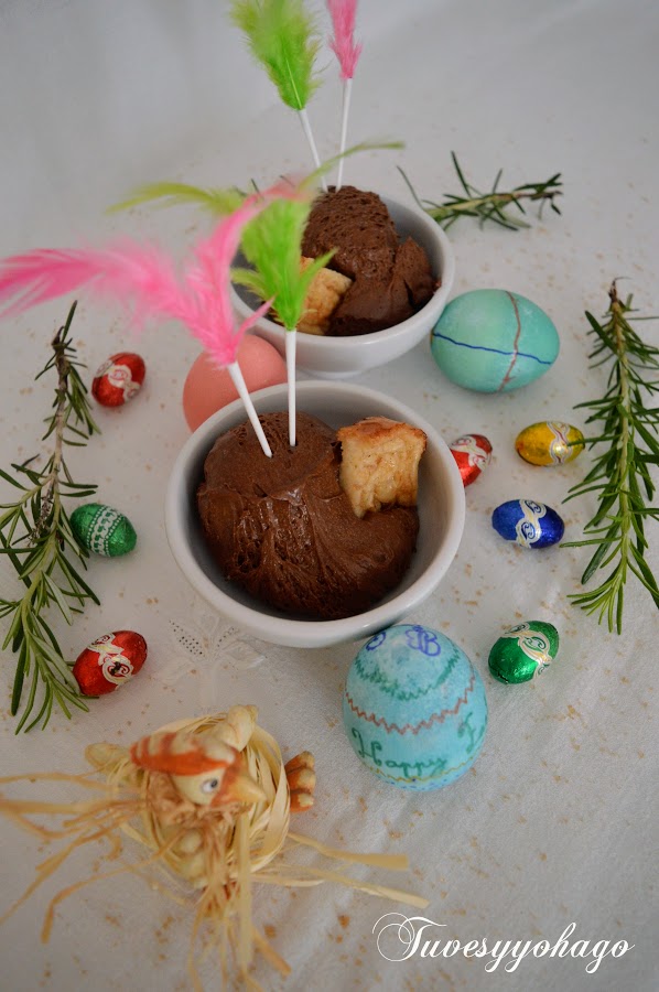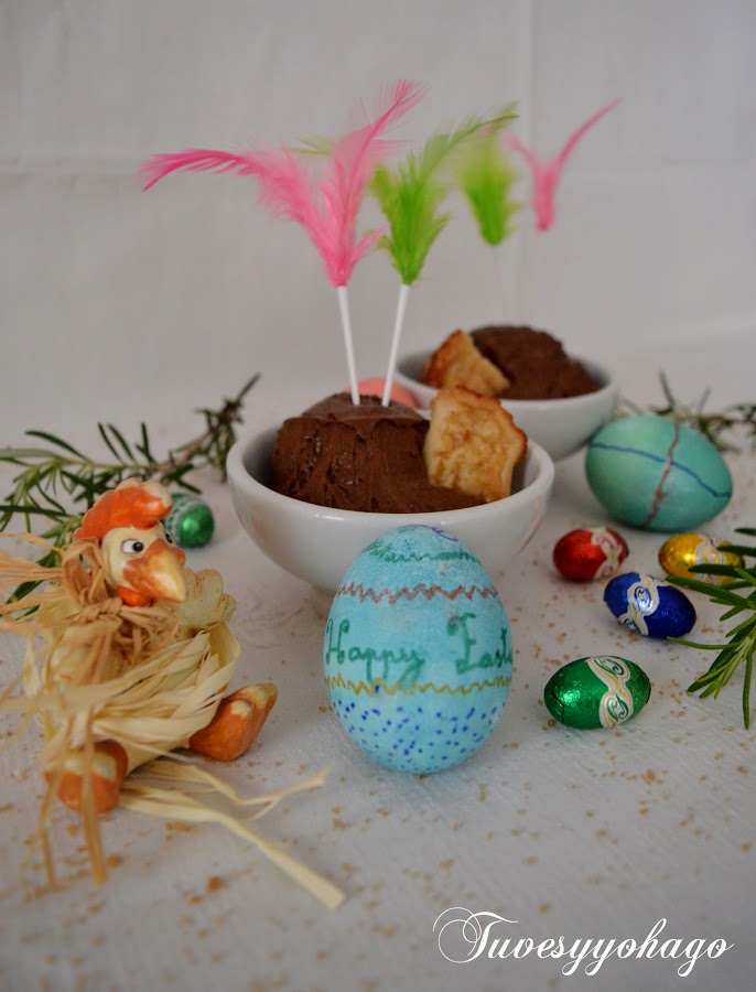 La mousse de chocolate es un postre que podemos preparar todo el año, pero estamos en Pascua y ahora está todo lleno de plumas, huevos, pollitos, etc; mi hija Blanca ha decorado unos cuantos huevos en su academia de inglés, así que los he aprovechado para ambientar un poco la presentación de esta delicia junto a un trocito de torrija, uniendo una tradición española con otra anglosajona.