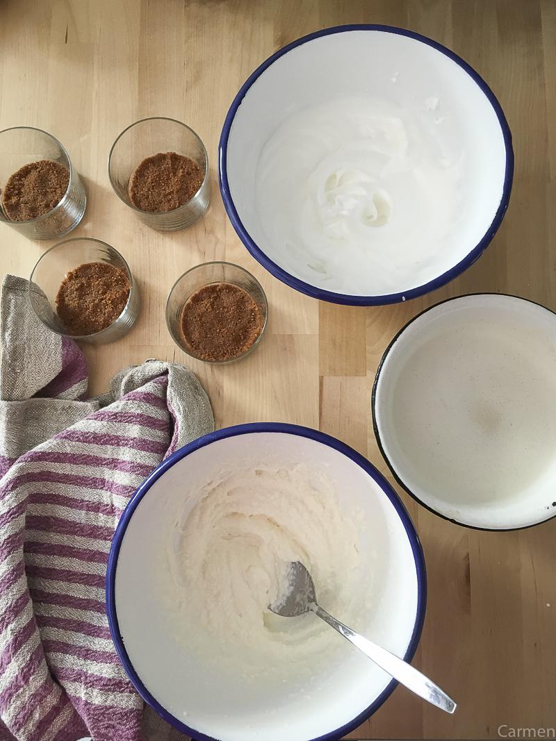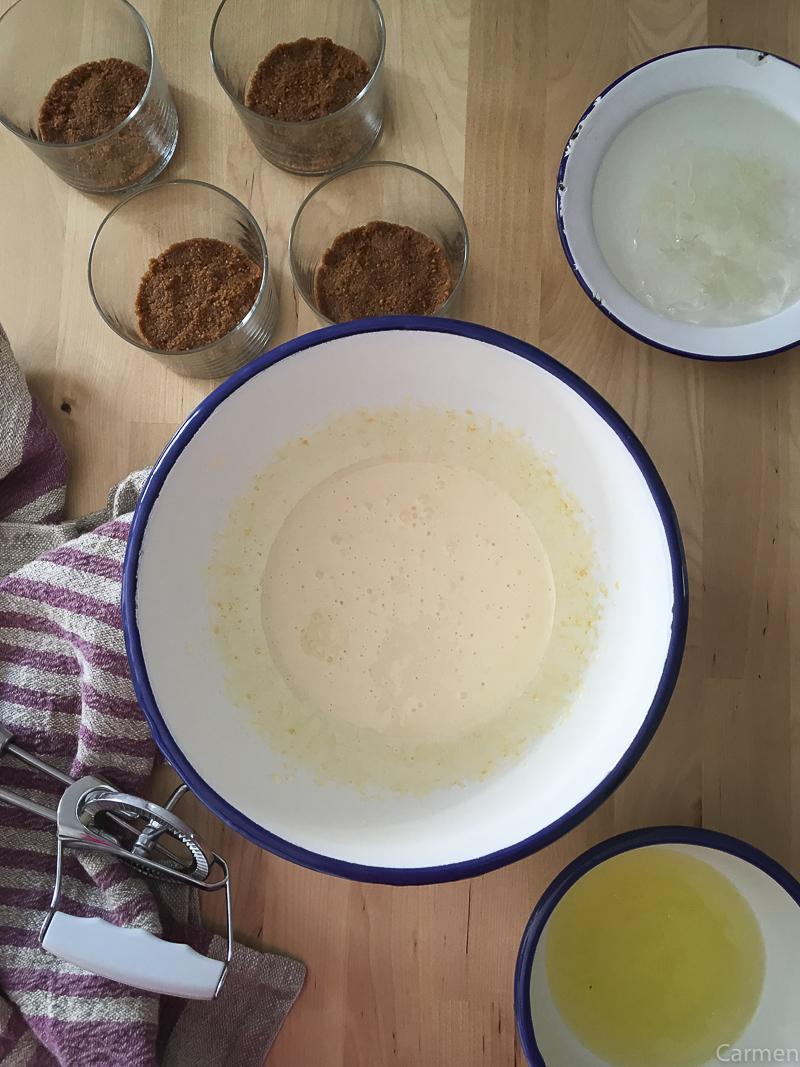 Tritura las galletas y mezcla con la mantequilla a temperatura ambiente. Con esta mezcla cubre el fondo de los vasitos sin aplastar demasiado. Reserva los vasitos en el frigorífico.