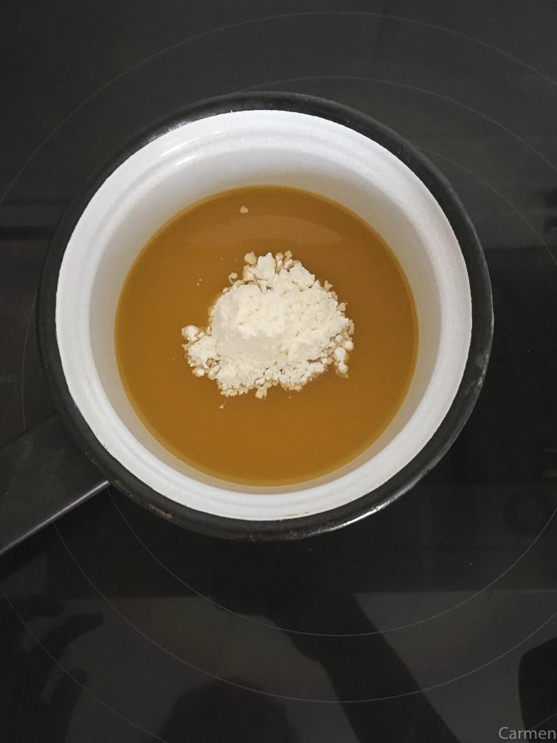 Prepara la crema de mango poniendo en un cazo el granini Selección de mango con la harina de maíz y calienta hasta que hierva ligeramente y se disuelva, sin dejar de remover. Reserva