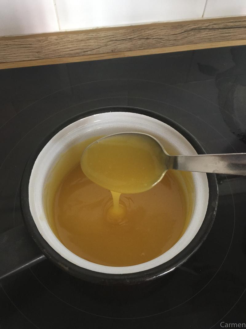 Aparta del fuego y disuelve las hojas de gelatina en la crema anterior. Deja que se temple la mezcla