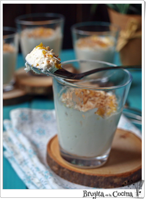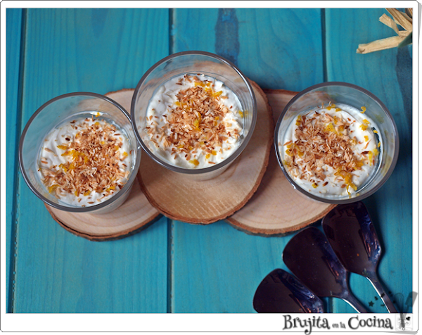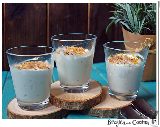 Vertemos en los vasos de presentación, tendremos más o menos según el tamaño del vaso, decoramos con ralladura de limón y coco rallado tostado.