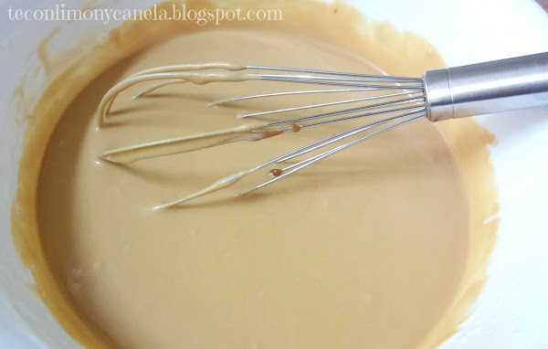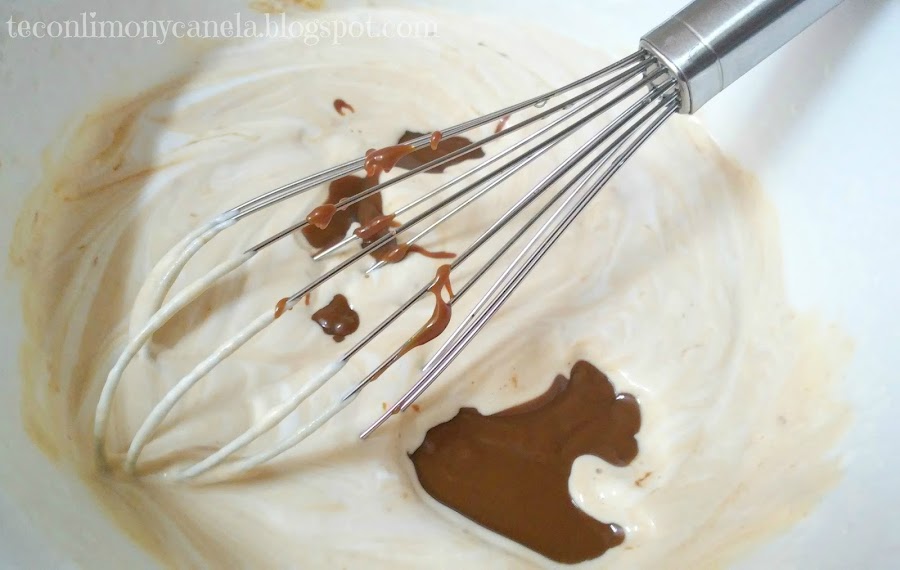 Esperamos a que se atempere el dulce de leche y vamos incorporando poco a poco con las varillas manuales.