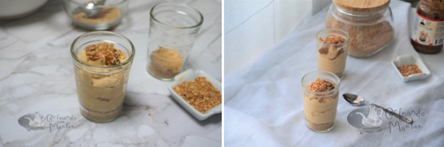Cogemos unos vasitos y cubrimos la base con un poco de galleta, yo no he puesto mantequilla, se puede poner. Echamos parte de la crema, ponemos otra capa de galletas y terminamos con más crema. Se puede preparar con varias capas de galletas o sin ninguna.