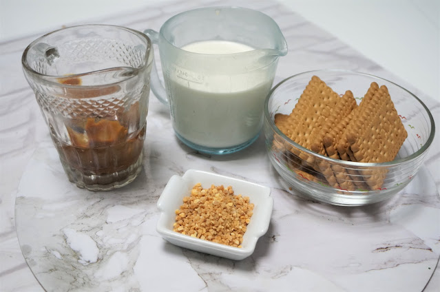 Empezaremos triturando las galletas, se pueden trocear con las manos. Ponemos la nata (crema de leche) bien fría en un bol, el dulce de leche también ha de estar frío. Añadimos parte del dulce de leche, lo mezclamos con la nata (crema de leche) suavemente.