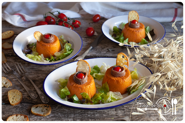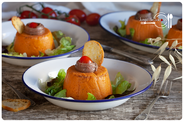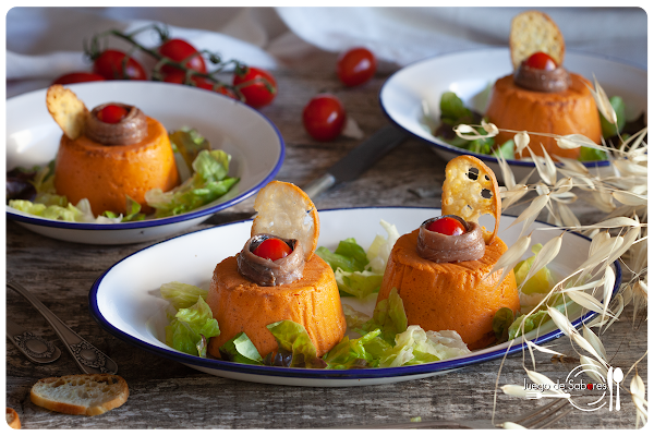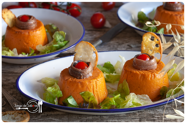 Dejar enfriar los moldes y decorar con filetes de anchoa y tomatitos cherry.