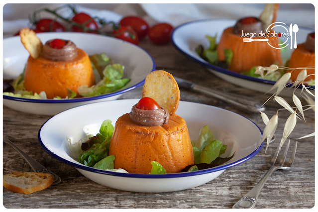 Ésta es una receta que solíamos hacer a menudo años atrás y que, no sabemos muy bien porqué, cayó en el olvido hasta que un día que contábamos “batallitas” de antaño salió el tema de la mousse de escalivada y quisimos rememorar tiempos pasados. Antes la presentábamos en un bloque porque usábamos un molde de los de hacer plum-cake. Hoy hemos preferido utilizar los moldes de los flanes para hacer raciones individuales. La presentación es distinta pero el sabor es el de antes. Sigue gustándonos y repetiremos.