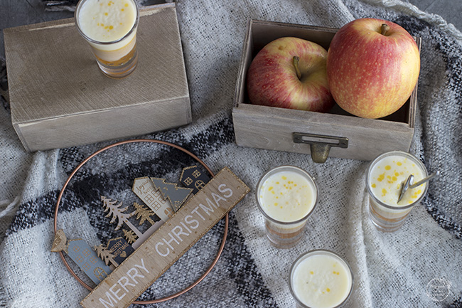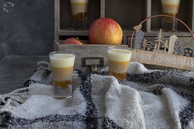 Pelamos las manzanas y las troceamos, añadimos a un cazo al que le ponemos unas gotas de zumo de limón y un poco de agua. Cocinamos durante unos cinco minutos hasta que veamos que se ablanda un poco la manzana y añadimos el azúcar. Dejamos a fuego medio durante unos 15 minutos hasta que se nos dore y espese. Sacamos y trituramos. Añadimos al fondo de los vasitos.