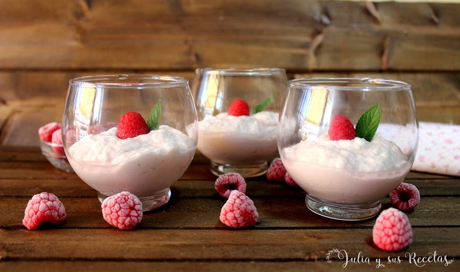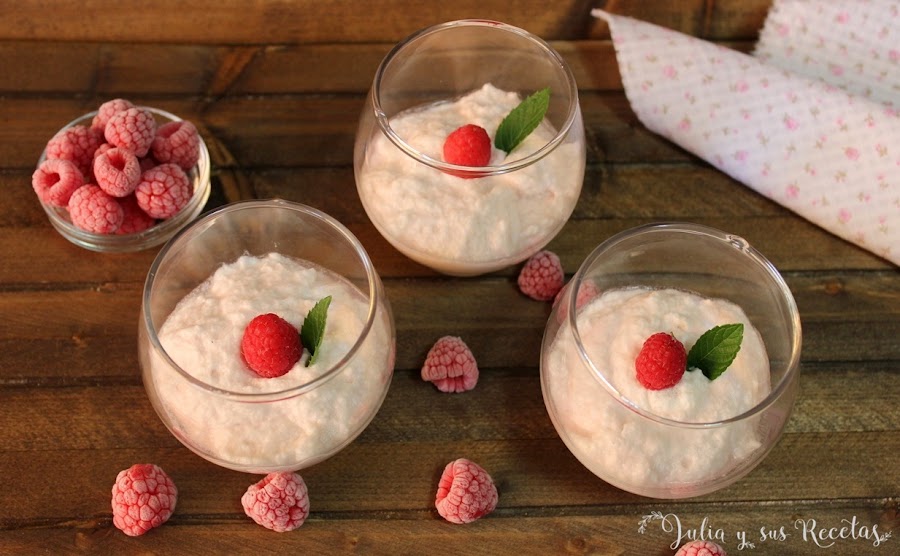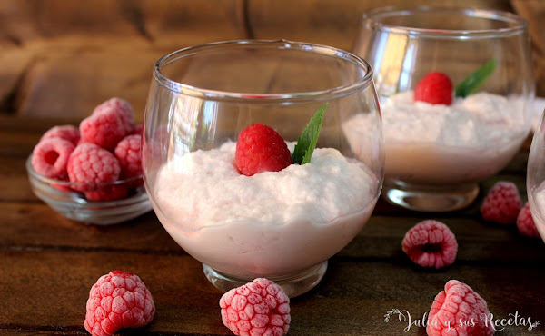 Lo servimos en copas y lo adornamos con una frambuesa y un hoja de menta fresca.