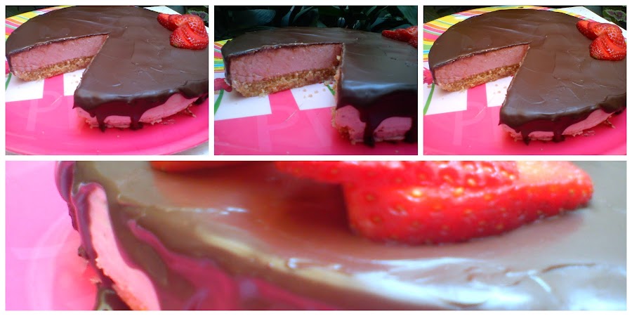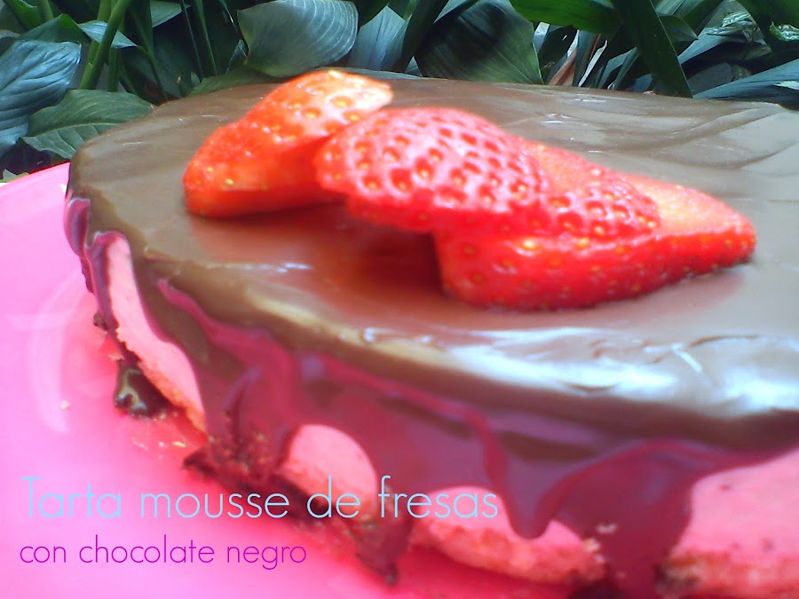La tarta de hoy es una mousse de fresas con cobertura de chocolate negro,un buen contraste de sabores.