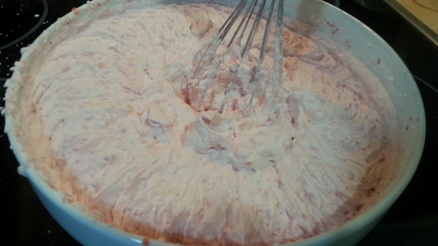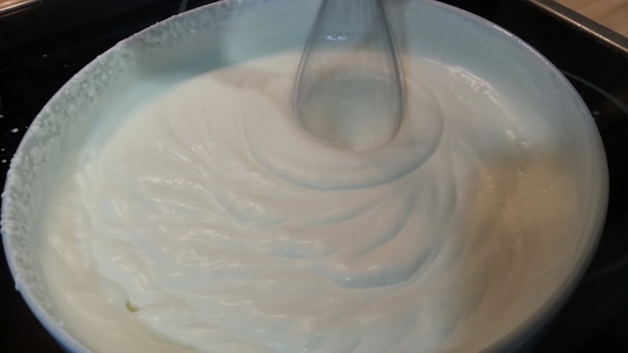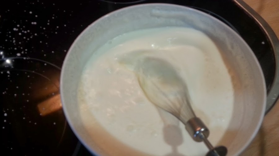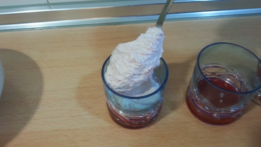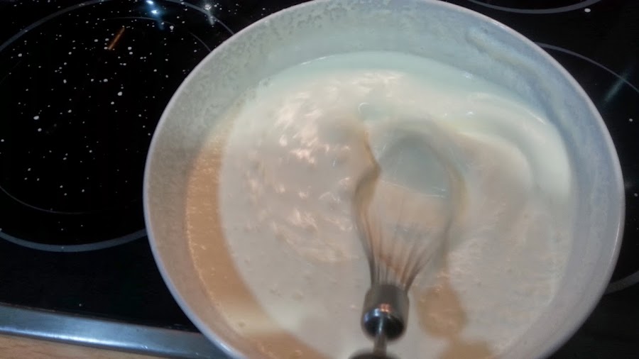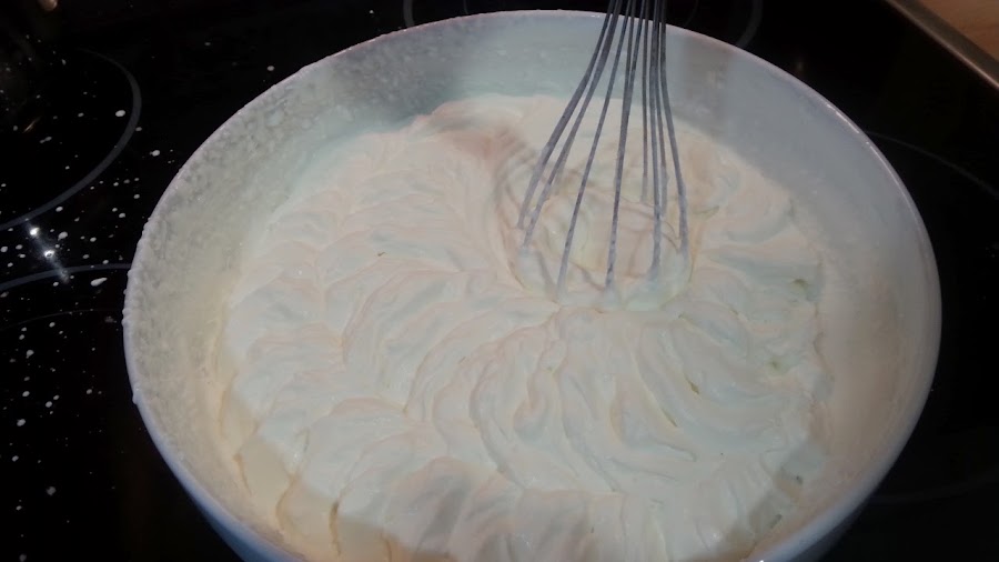 ahora echamos la nata (crema de leche) muy fria en un cuando y con una batidora de varillas empezamos a batirla