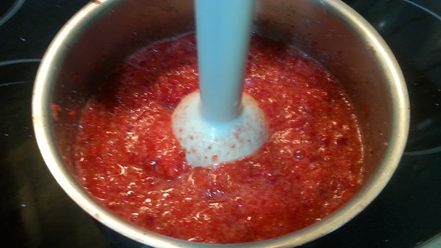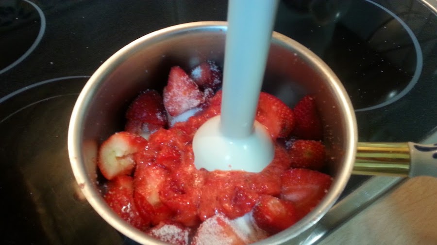 limpiamos las fresas y las cortamos en trozos, da igual el tamaño, las vamos a triturar