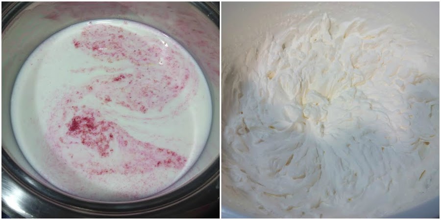 Deberéis empezar con el bizcocho si vais a usar esto de base de vuestra tarta. Yo le he puesto 2 planchas, una en la base y otra un poco mas pequeña en el centro. Puedes comprarlo hecho o prepararlo tu mismo siguiendo los pasos aquí. Es muy fácil y no se tarda mucho. Para hacer la mousse disolvemos el sobre de gelatina en leche y lo llevamos a ebullición. Cuando rompa a hervir apagamos y reservamos. Mientras tanto, montamos la nata (crema de leche) (que estará muy fría) con los 50 g de azúcar. Cuando la mezcla de la gelatina haya templado un poco, la mezclamos con la nata montada (crema de leche) con movimientos envolventes hasta que quede una textura lisa y homogénea. Vertemos la mezcla al molde y reservamos en la nevera.