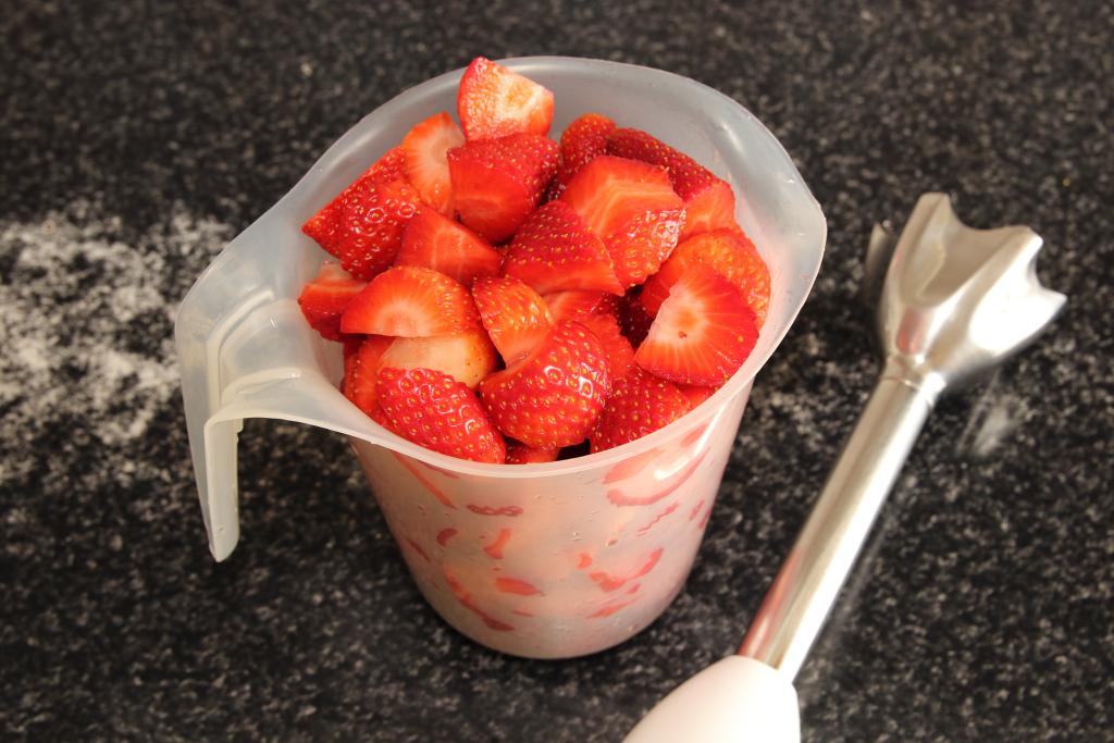 Escogemos los vasitos o recipientes de presentación y reservamos.Lavamos y retiramos el pedúnculo a las fresas, troceamos y pasamos a un vaso o jarra. Trituramos con la batidora hasta conseguir un puré homogéneo. Reservamos.