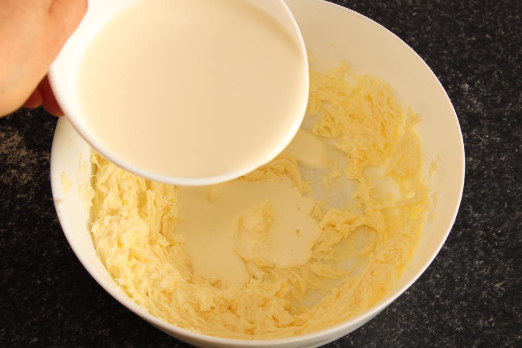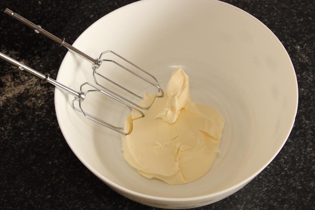 En un bol amplio echamos el queso, batimos con las varillas eléctricas y añadimos el azúcar en tres veces, seguimos batiendo. Incorporamos la nata (crema de leche), también en tres veces, seguimos batiendo.