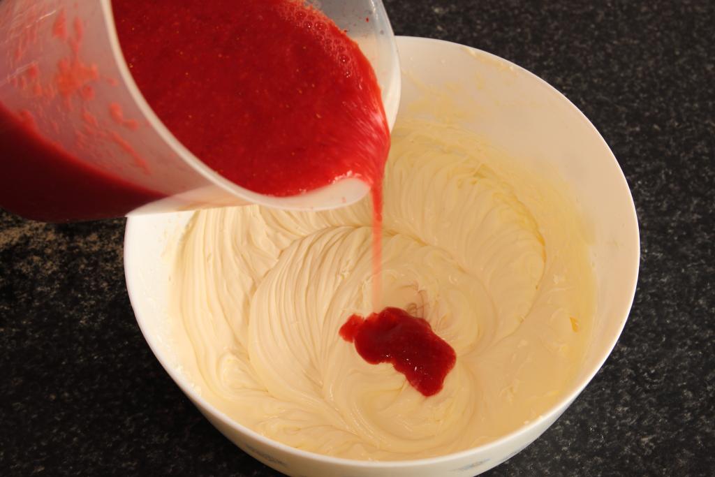 Vertemos el puré de fresas (reservamos un poco para decorar) poco a poco, seguimos batiendo la mezcla hasta que los ingredientes queden bien integrados.