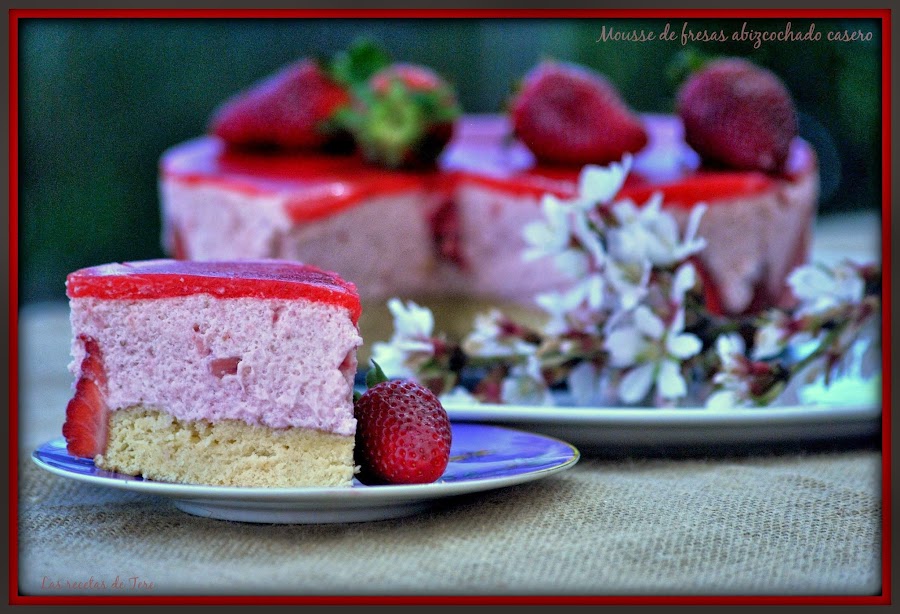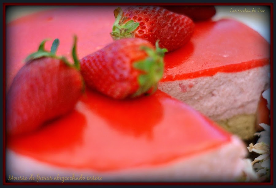 Antes de introducir la mousse encima del bizcocho pon unas fresas laminadas entre la pared del molde y la base, ahora vierte la mousse y mete en la nevera por unas 4 horas mínimo o si lo haces desde el día anterior lo dejas en la nevera toda la noche.