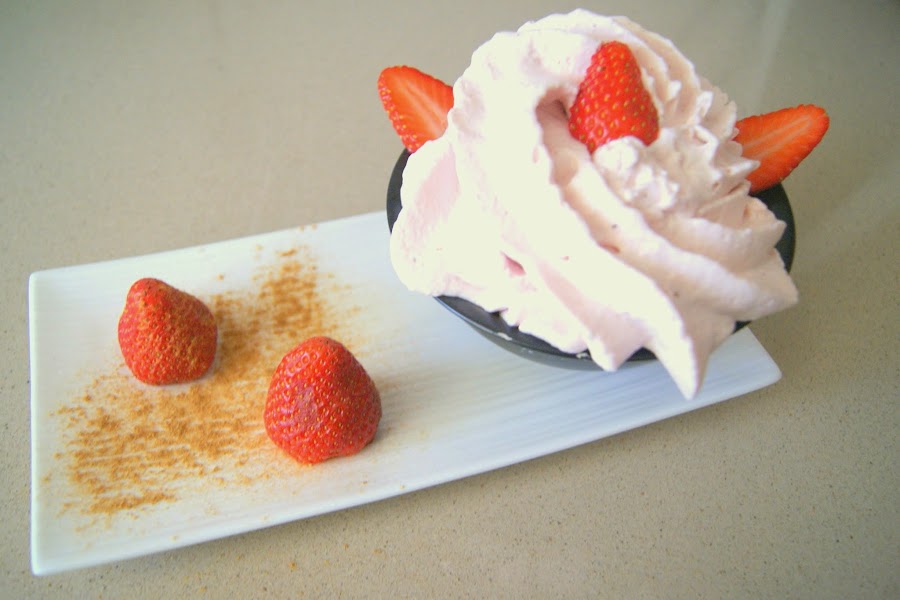 Cuando preparemos la mousse, ponemos en un cuenco los piñones tostados, sacamos el sifón, lo agitamos fuerte varias veces y ponemos la mousse. Decoramos con unas fresas cortadas a rodajas.
