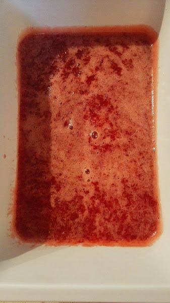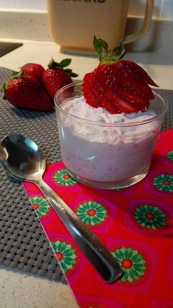 Mezclamos las fresas con la nata (crema de leche) y por último con las claras. Con movimientos envolventes y con cuidado de que no se nos baje.