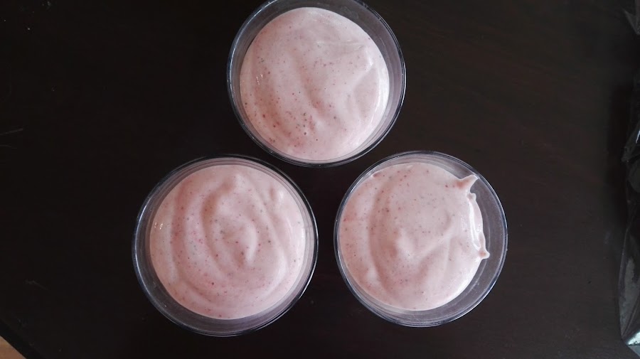 "El Secreto del Chef" es ponerle algunos trozos de fresas al fondo de los vasitos que vamos a utilizar para presentar la mousse.