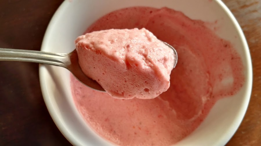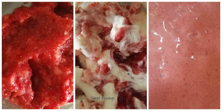 Trituramos en la licuadora las fresas hasta hacerlas puré y luego agregamos y mezclamos el queso crema, la nata (crema de leche) y 50 gramos de azúcar.