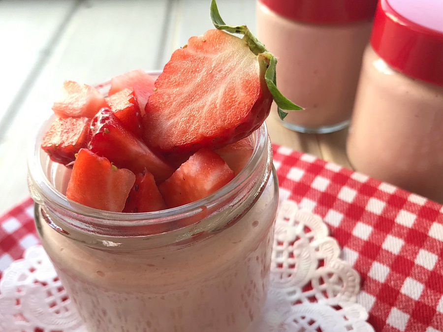 6. Cuando vayamos a servir, troceamos los 50 g de fresas de la decoración bien pequeñitos. Repartimos las fresas troceadas por encima de los vasitos de mousse.