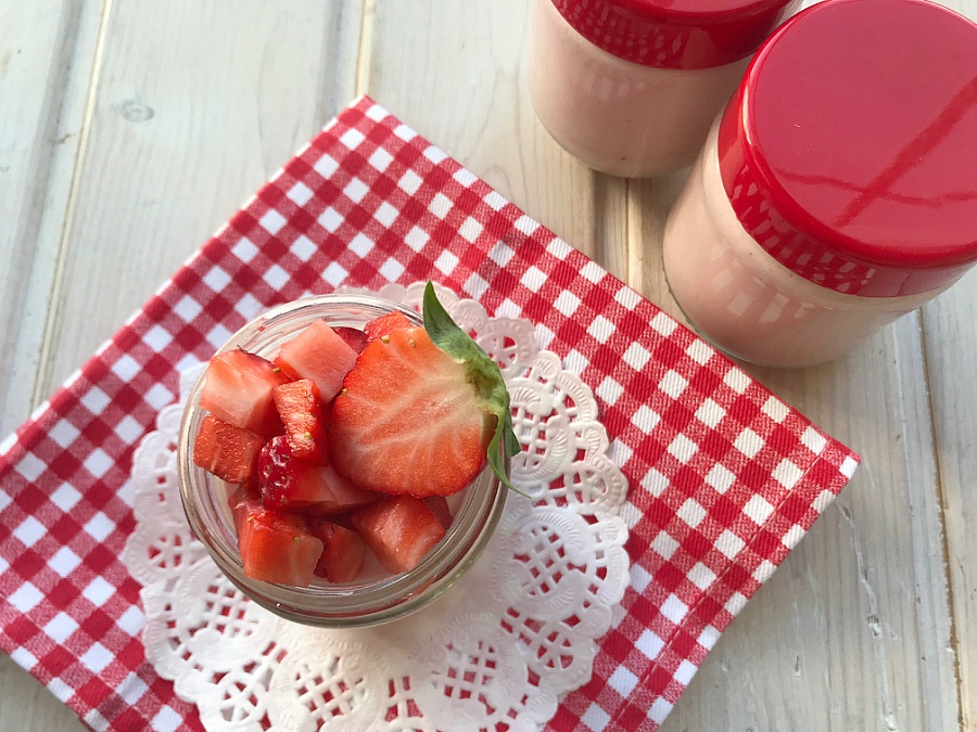La verdad es que sólo le hice un cambio, porque yo preparé la mitad de cantidad de su receta, y para que no se me quedase empezado tanto el brick de nata (crema de leche) como el yogur natural... pues puse sólo nata (crema de leche) en más proporción. Mis cantidades dan para 4 vasitos de yogur, y pongo un poquito más de fresa para acompañar, así le damos un toque fresco que contrasta genial con la suavidad de la mousse.