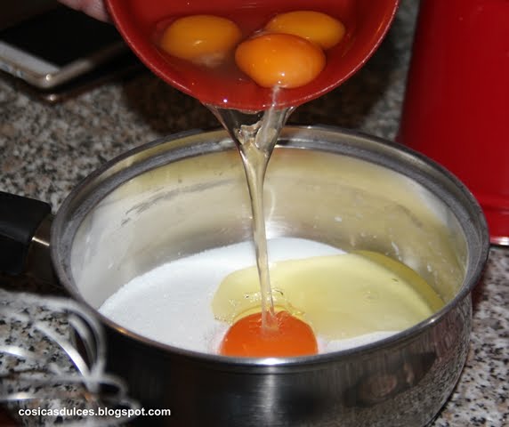 En un cazo mezclamos muy bien el azúcar con la maicena. Cuando los dos ingredientes estén bien integrados añadimos las yemas y los huevos y batimos ligeramente.